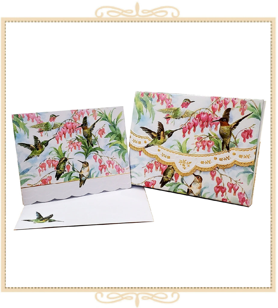 10 embossed and die-cut themed note cards with coordinating embossed, die-cut envelopes in an embossed, die-cut gift box.