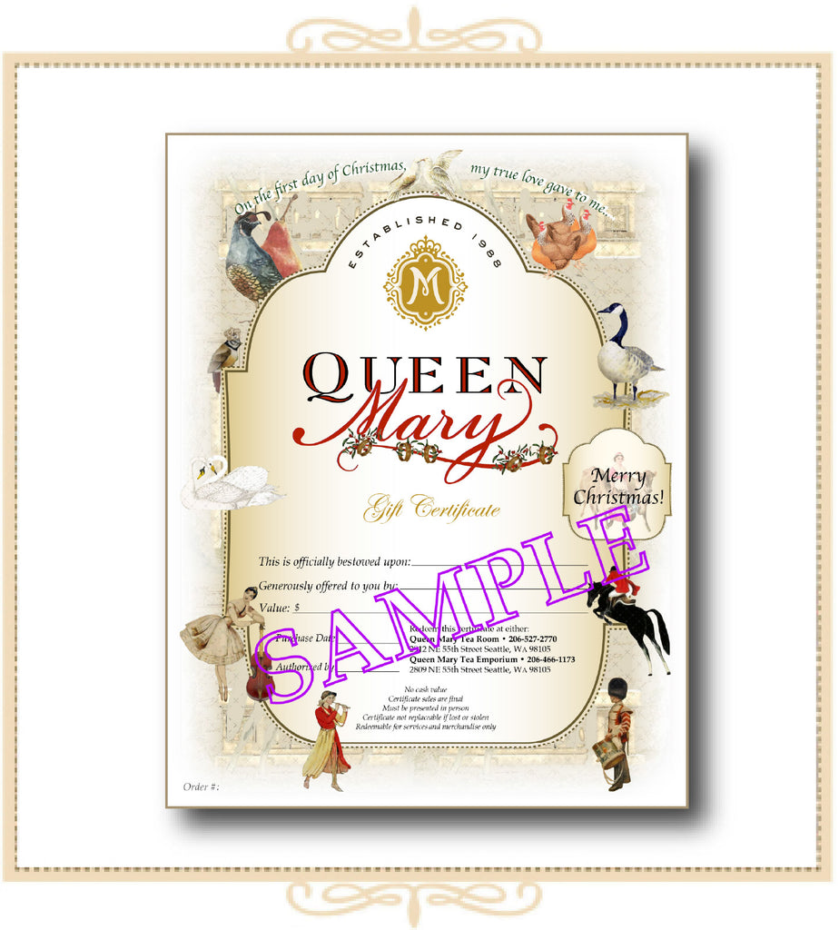 Queen Mary Gift Certificates are the perfect gift for anyone! These can be redeemed at the Tea Room or the Tea Emporium. Online gift certificates are not available at this time.