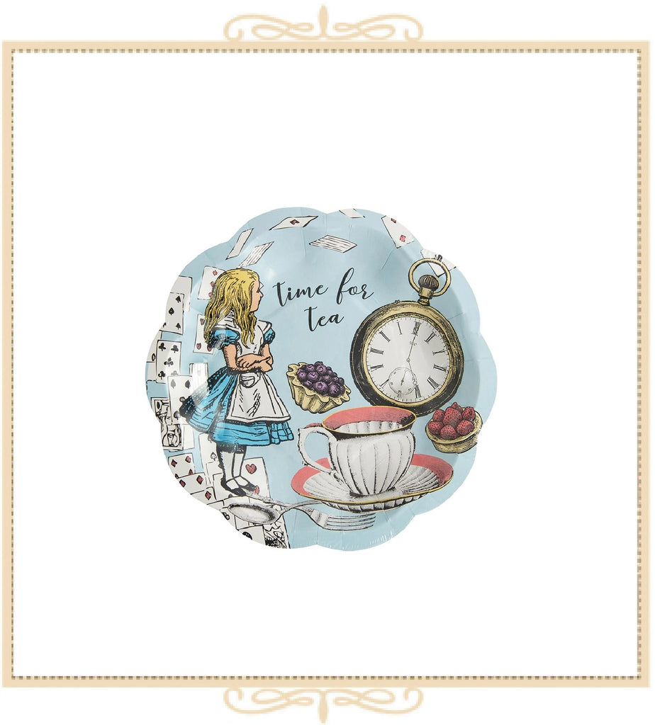 Blue illustrated Alice in Wonderland Paper Plates by Talking Tables. This pack of 12 small paper plates are perfect for a Mad Hatter Tea Party, birthday, picnic or garden party! These pretty paper plates are suitable for kids or adults of any age and are eco-friendly plates. Both product and packaging are plastic free and can be easily recycled in your home recycling bin.