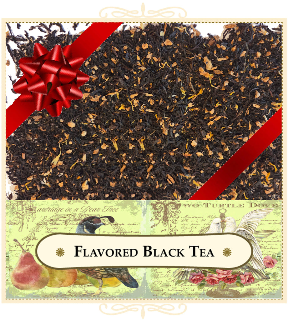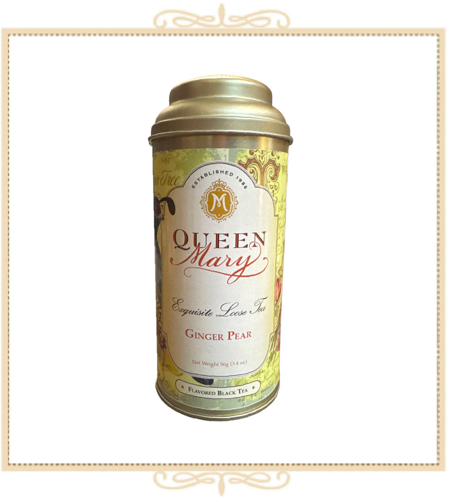 Queen selected black teas, ginger root pieces, pear flavoring, and marigold petals. Contains caffeine.