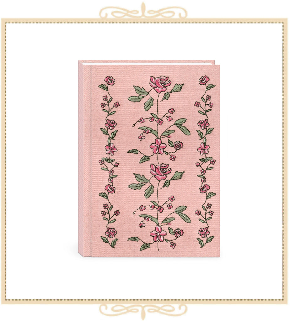 Hard cover fabric journal embroidered with pink roses.