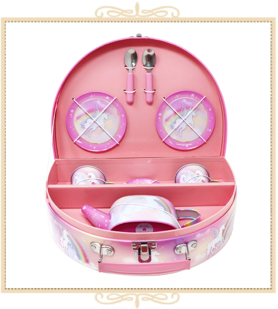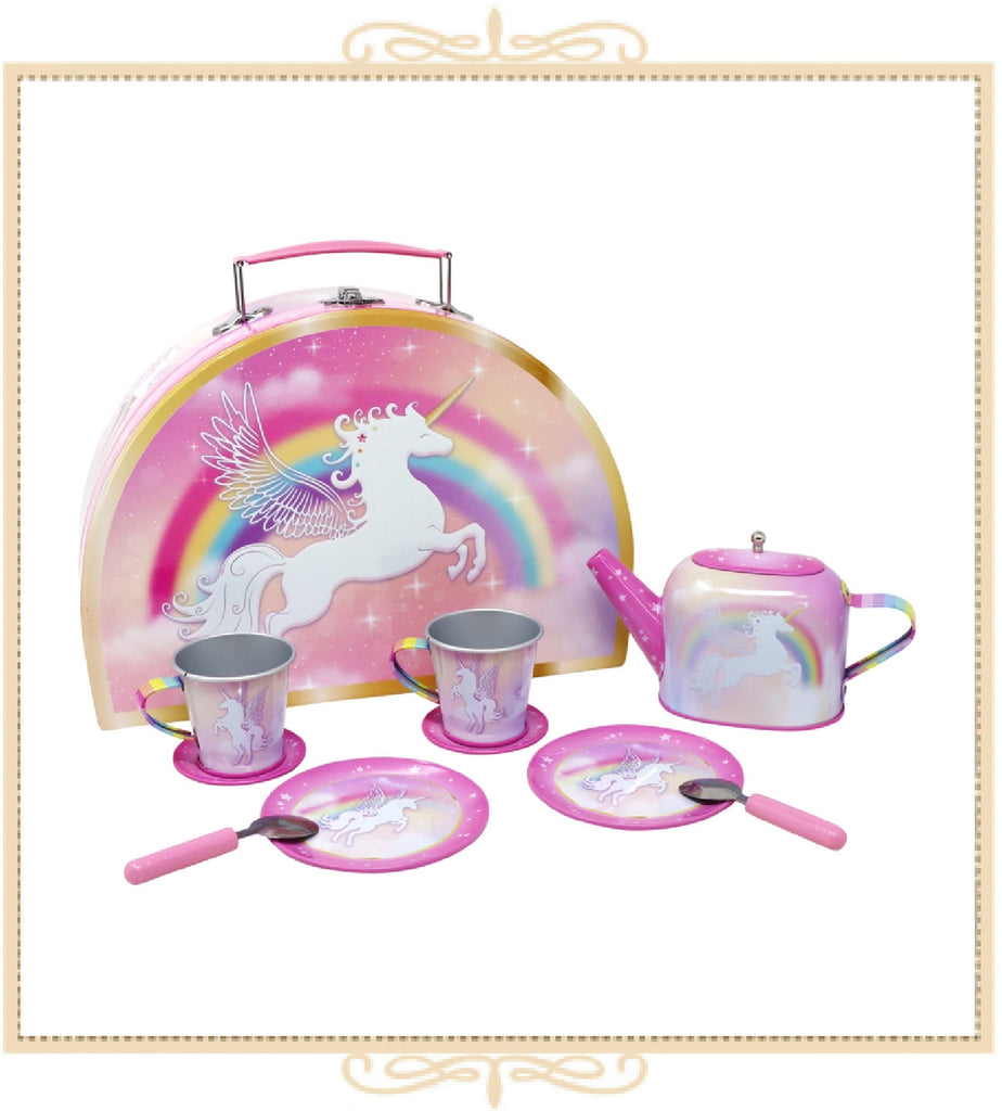 Inspired by the Unicorn Dreamer, this tin tea set comes with everything your little one needs to host a tea party for 2. Includes 9 pieces made from lightweight tin which is safe for clumsy little hands. Stored in a beautiful matching carry case. Ideal for creative & imaginative play indoors & outdoors.